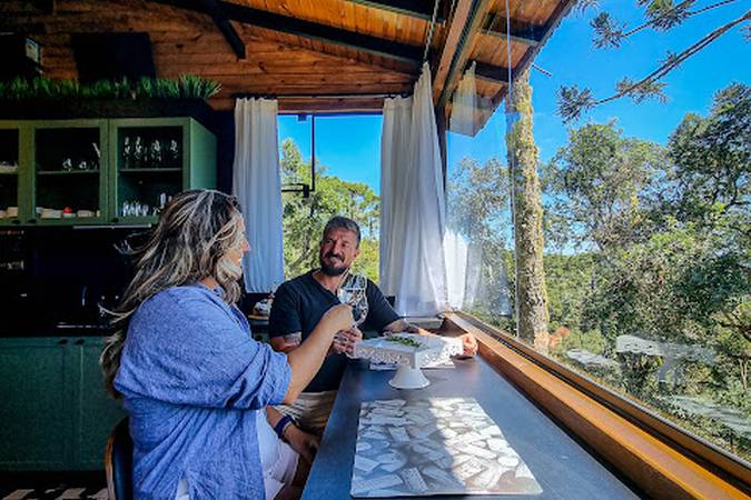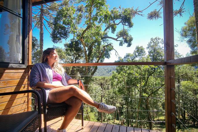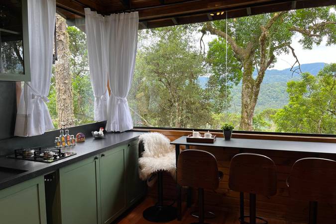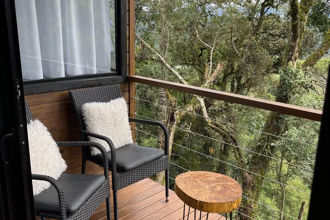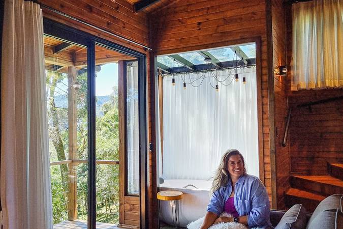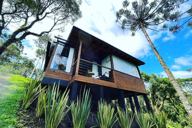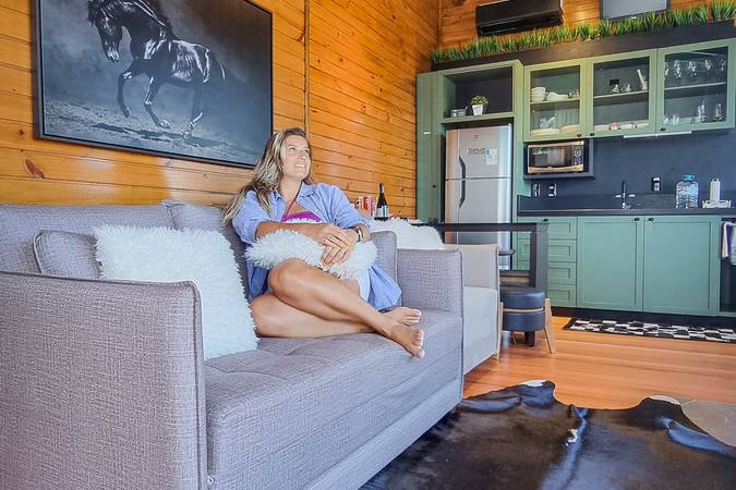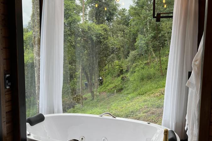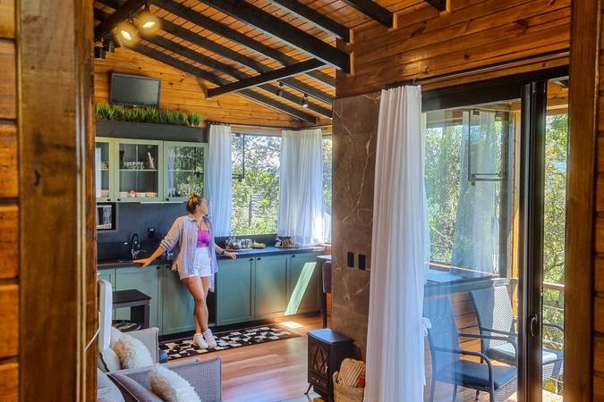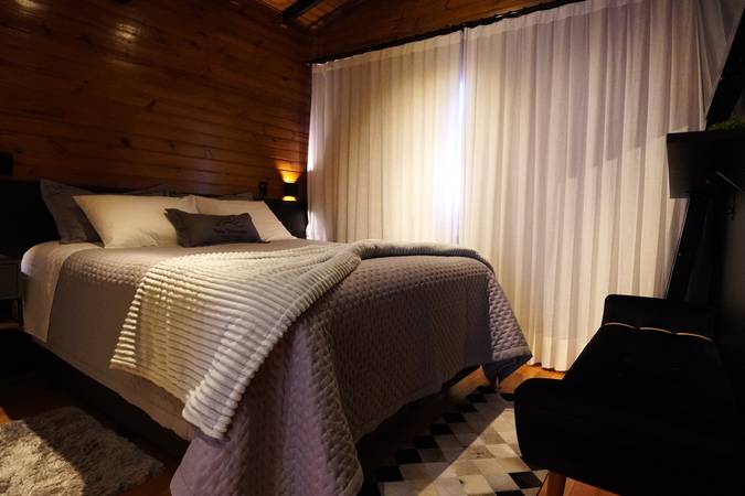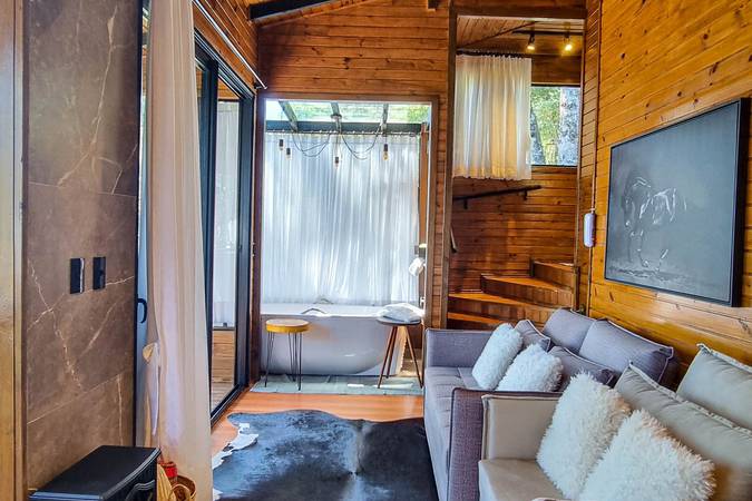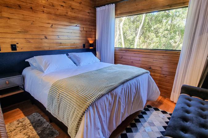 Possui um quarto com cama Queen Size, sofá-cama casal na sala, banheira com vista panorâmica, varanda privativa e cozinha totalmente equipada. Toda cabana (inclusive banheiro) com piso aquecido e lavatório ao lado do banheiro.