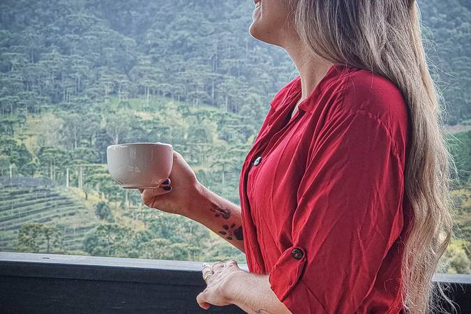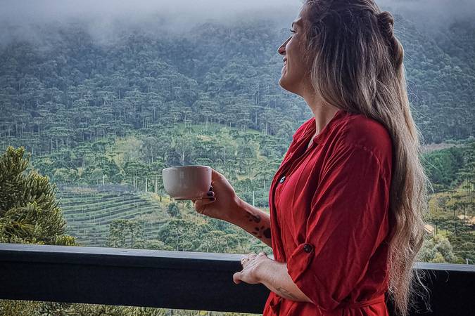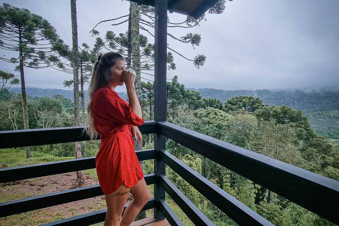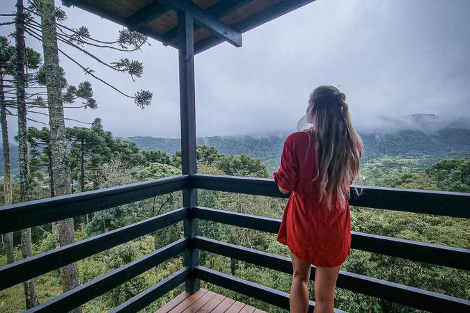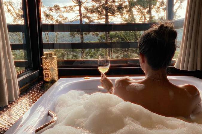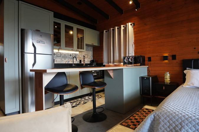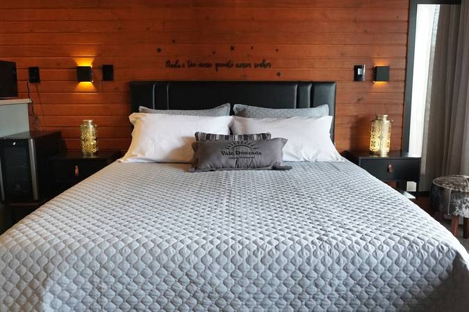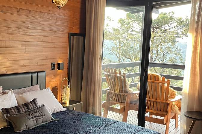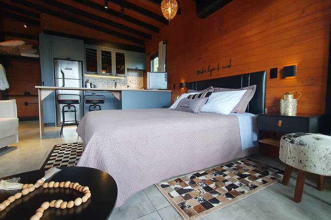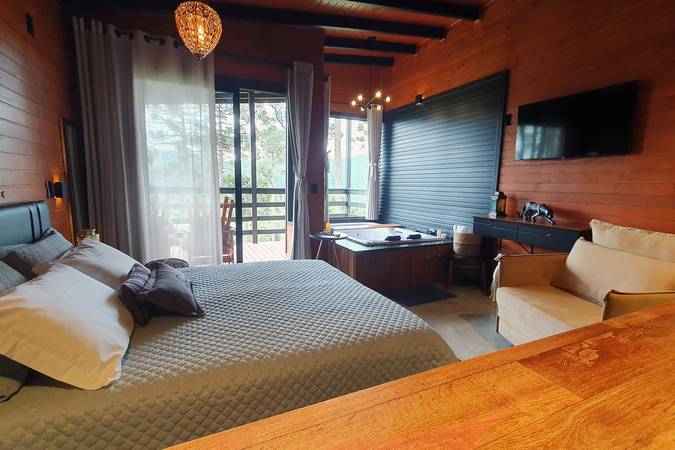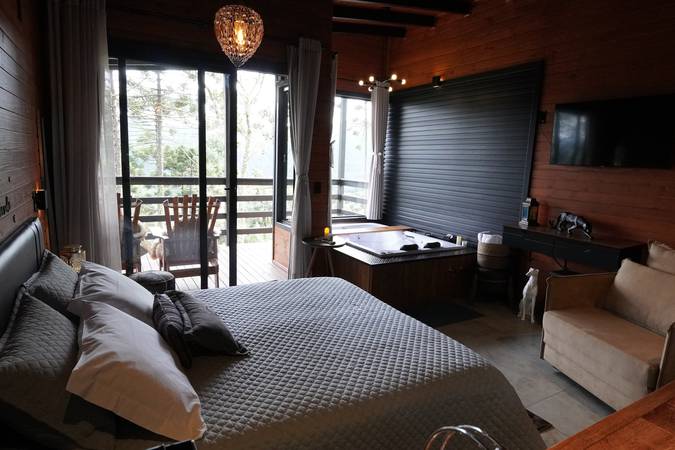 Oferece cama Queen Size, sofá-cama solteiro, banheira com vista panorâmica, lareira elétrica, piso aquecido por toda cabana (inclusive o banheiro), lavatório ao lado do banheiro e cozinha equipada.