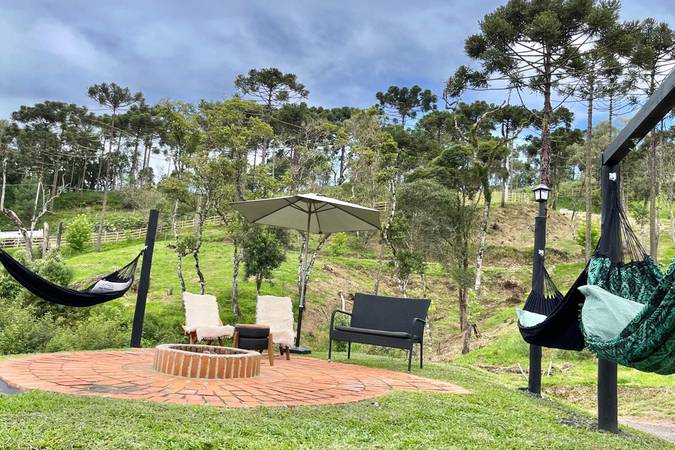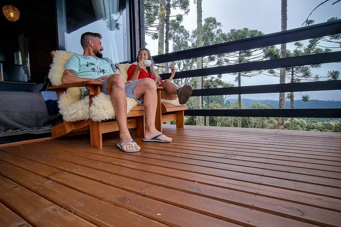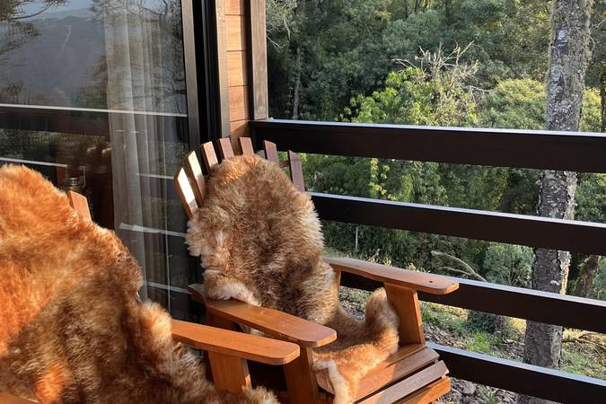 Varanda privativa com cadeiras para apreciar a natureza. Ideal para 2 pessoas, garantindo uma estadia confortável e privativa em um ambiente rústico e sofisticado.